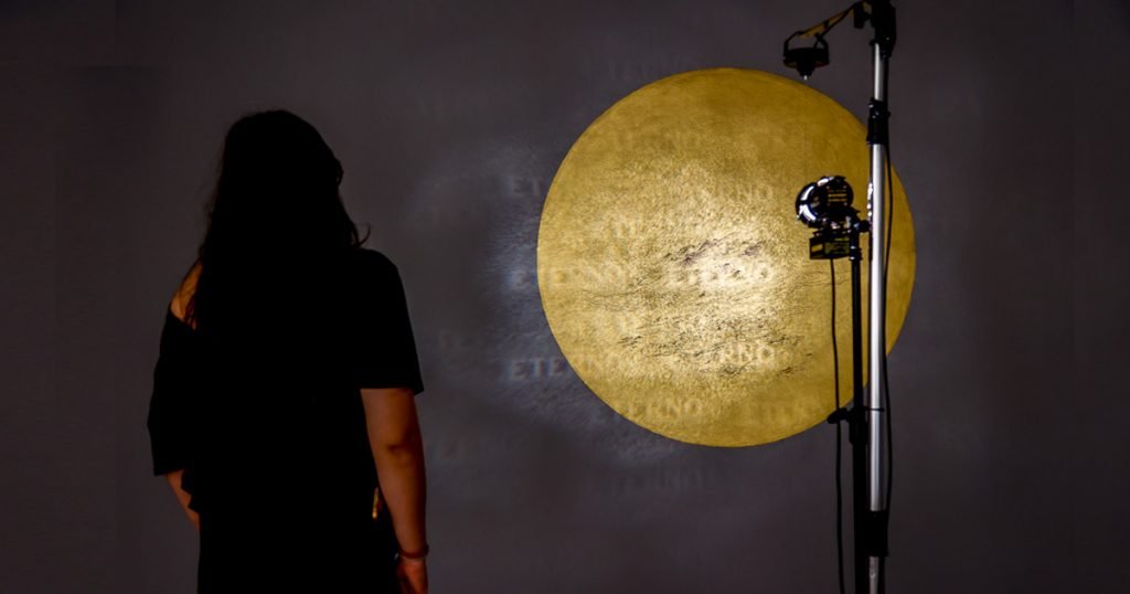 É o caso, por exemplo, da instalação Eternidade (2025), dos artistas Sandra Cinto e Albano Afonso. Na parede, a dupla pintou um círculo dourado onde é projetada a palavra “eternidade”. Em frente ao projetor, uma pequena esfera cristalina giratória é usada para simular um movimento de ondas nas palavras.