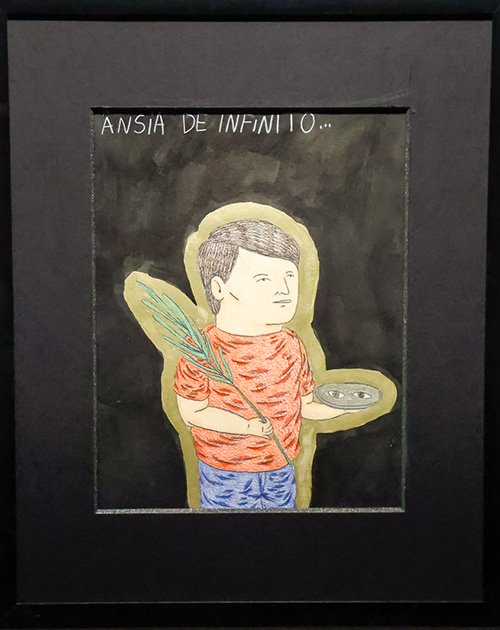 Outro quadro exposto é Ânsia de Infinito… (2023), de Estevão Parreiras. Ele retrata um garoto segurando uma bandeja com dois olhos em uma mão e uma longa folha na outra, imagem inspirada em Santa Luzia. Na história cristã, Santa Luzia era uma mulher de família nobre italiana que havia prometido ao pai permanecer virgem até a morte. Após a morte de seu progenitor, no entanto, sua mãe, muito doente, queria que se casasse com um jovem pagão. Diante disso, Santa Luzia propôs à mãe que fossem ao túmulo de Santa Águeda pedir pela cura da doença. Caso funcionasse – o que aconteceu –, isso seria uma mensagem para não se casar.