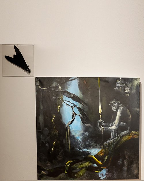 Também na mostra está a pintura O Guardião da Luz (2020-2022), de Fernando Lindote. Nela, um macaco é retratado em cima de uma árvore, segurando uma vela em meio à escuridão. A tela faz parte de uma série de nove quadros, chamada Homens Evoluem. “Nessa série, a figura do primata se repetia em diferentes posições, mas o personagem sempre tinha o rabo contorcido como o símbolo do infinito”, explica. O conceito da infinitude é usado para representar a resiliência do ser humano. “É essa insistência de segurar a luz num ambiente de trevas ou o esforço deliberado de fazer algo acontecer num ambiente não tão favorável”, continua.
