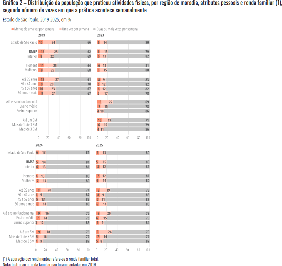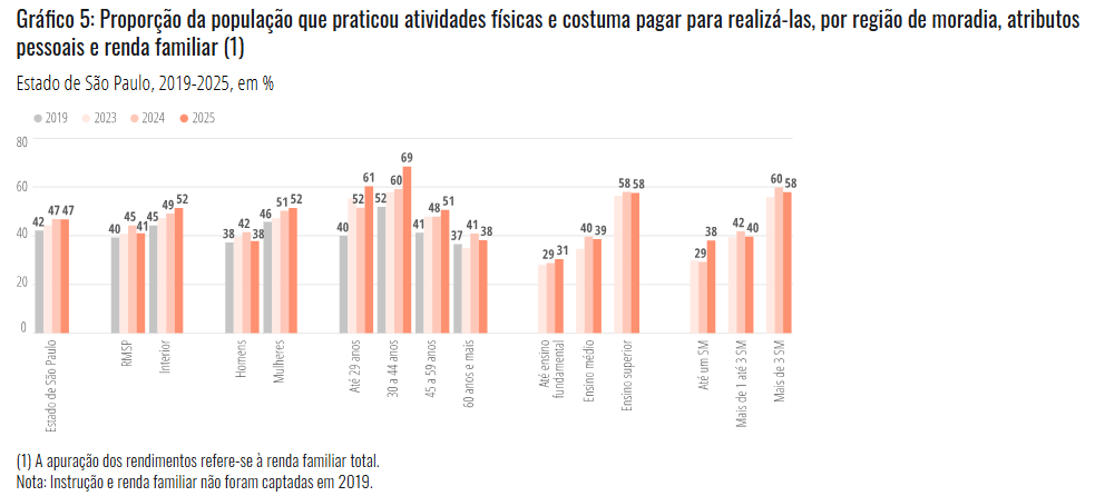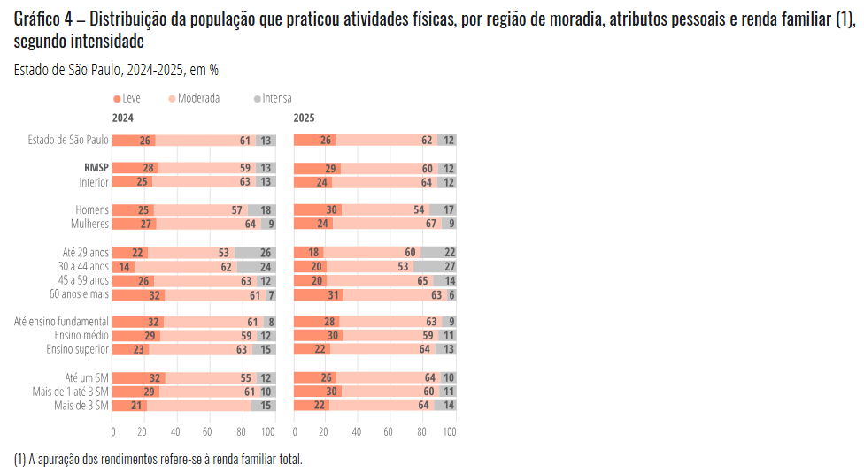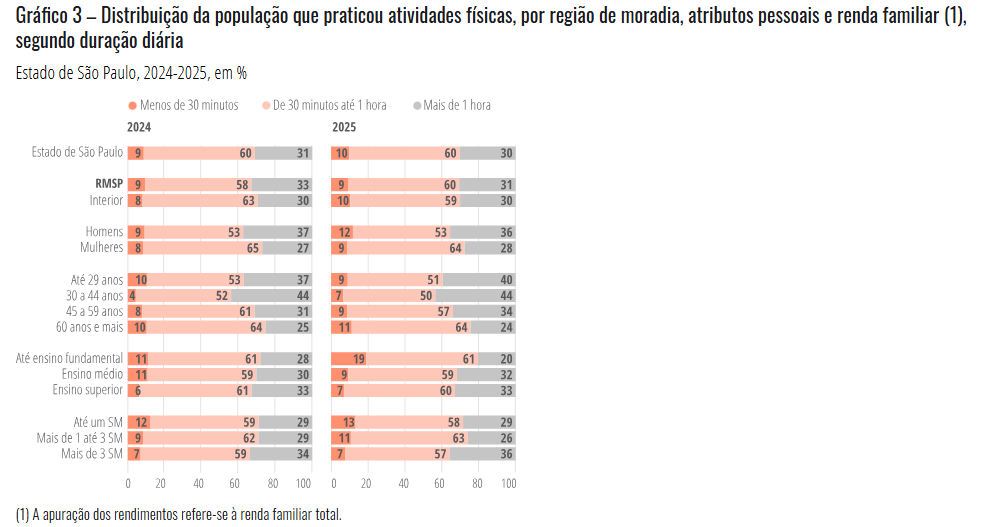 “Os dados revelam que o hábito de se exercitar está consolidado entre boa parte da população, mas ainda há desafios em segmentos com menor renda e escolaridade, especialmente entre os mais jovens”, destaca o estudo da Fundação Seade.