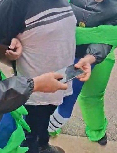 Os policiais estavam infiltrados entre os foliões, fantasiados de extraterrestres, quando flagraram três homens com uma bolsa vendendo bebidas fabricadas clandestinamente, sem qualquer tipo de rótulo ou marca. Os três foram presos e o material, apreendido.