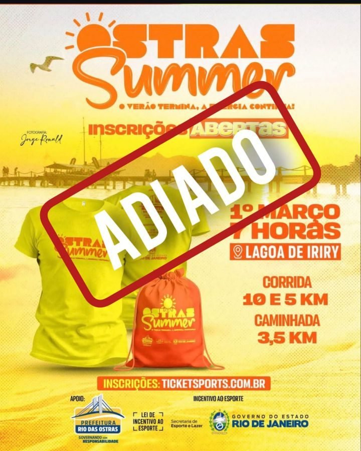 A organização da Corrida Ostras Summer informa que, em razão das chuvas registradas na cidade, o evento foi adiado para garantir a segurança dos atletas e do público. A competição foi transferida para o próximo domingo, dia 8 de março, mantendo toda a programação prevista, na Lagoa de Iriry.
